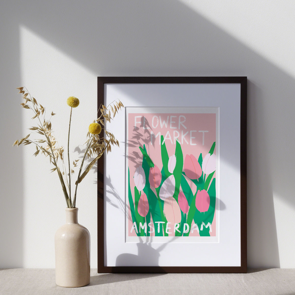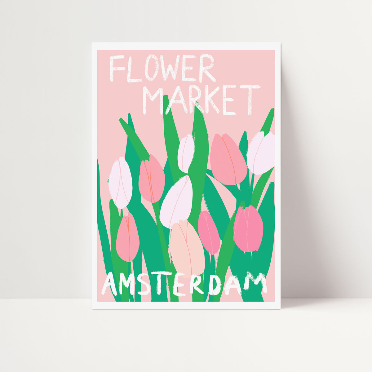 This art print features beautiful pink tulips that Amsterdam is famous for.