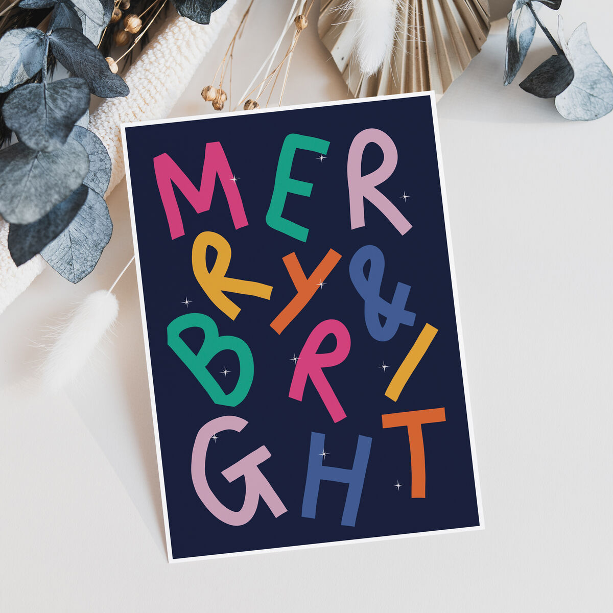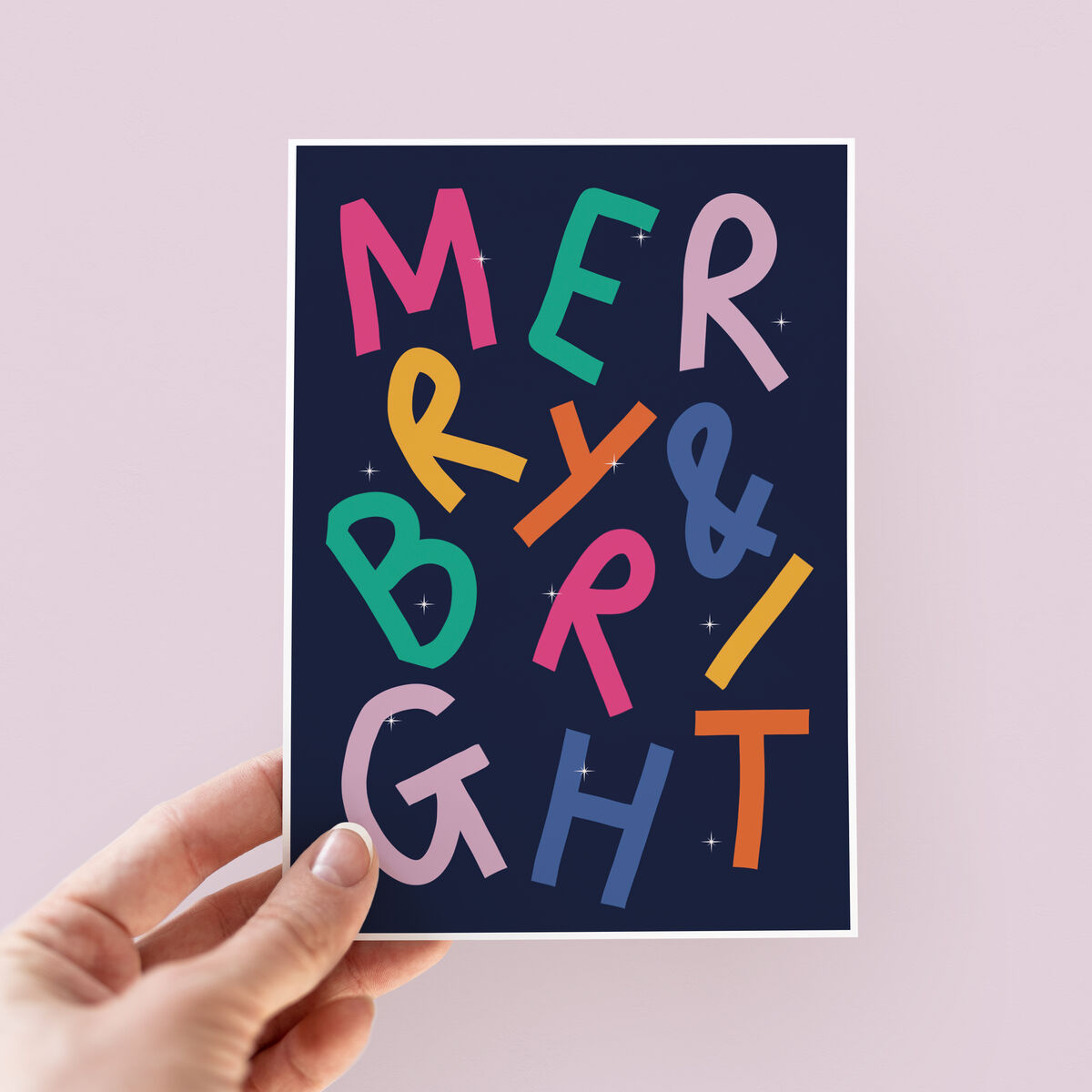 Merry & Bright colourful typographhic style Christmas card for family and friends.