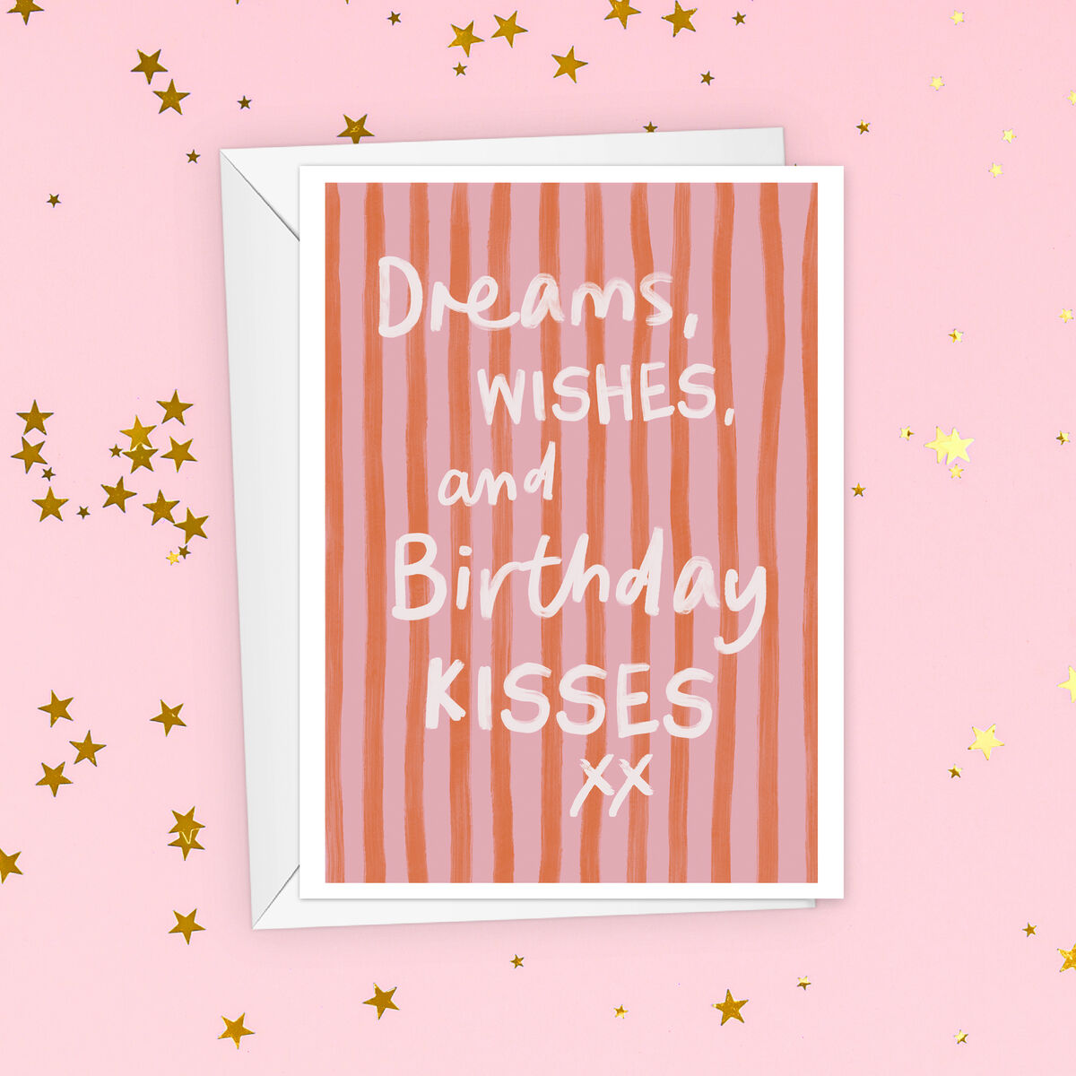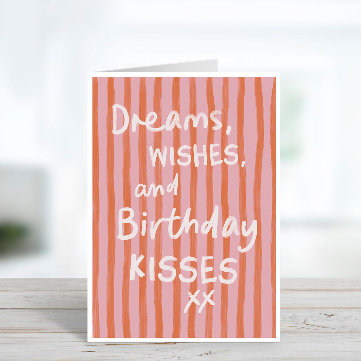 This whimsical birthday card features the sweet and sentimental message 'dreams, wishes and birthday kisses.'