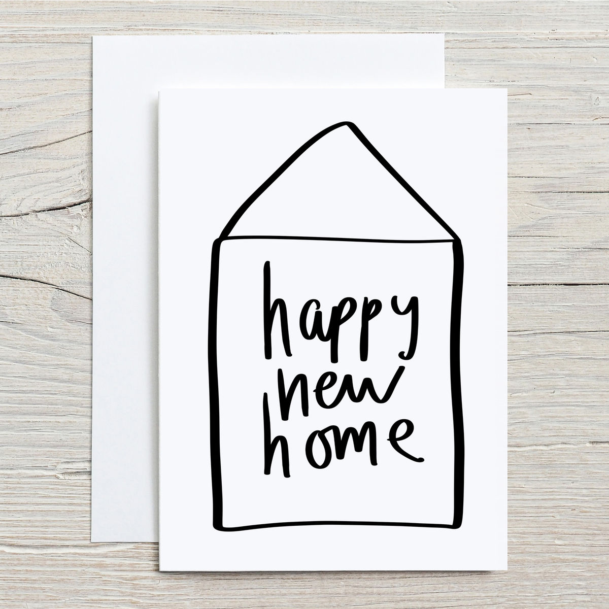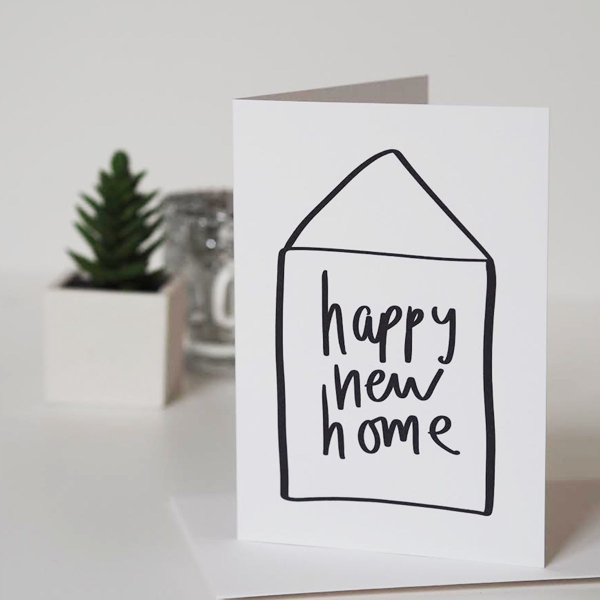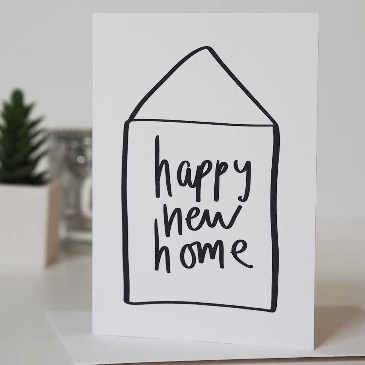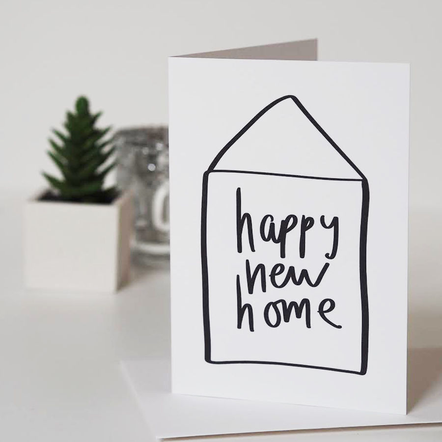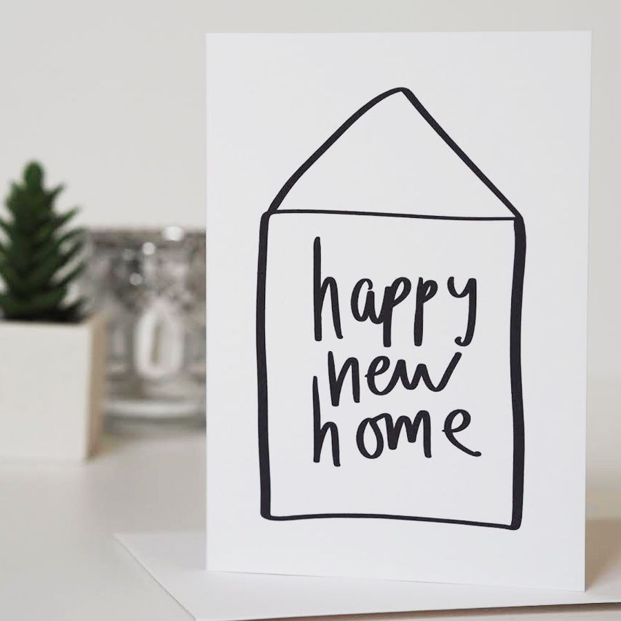 A simple hand lettered house warming card, wishing a Happy New Home.