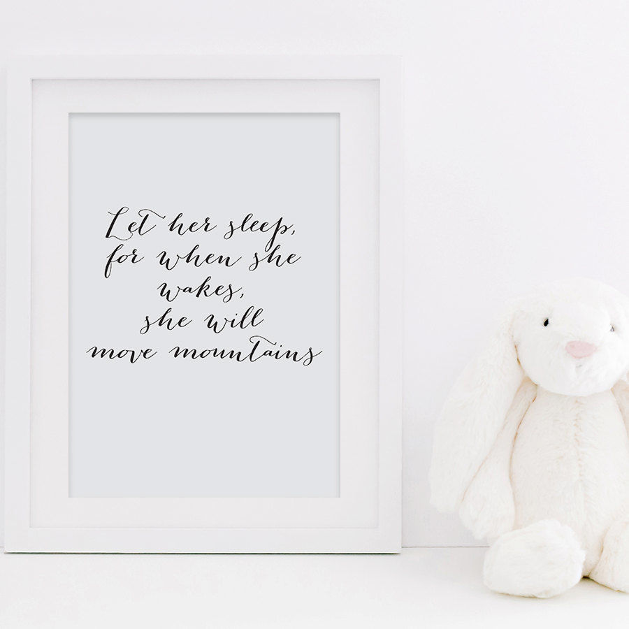Let her sleep, for when she wakes, she will move mountains- Shakespeare quote print for the nursery.